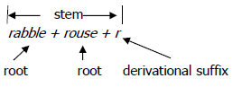 derivational affixes too, as in rabble-rouser-r;