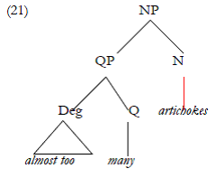 (19) [QP [DegP almost too] many] artichokes many [AP [DegP very very ] green] artichokes